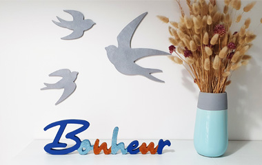Le site a été créé dans cet esprit, pour offrir à tout le monde la possibilité d’avoir des décorations originales et créatives à la maison. Comment faire ? C’est tout simple. Nous vous offrons les pièces, à vous de les personnaliser pour obtenir les décorations que vous souhaitez. Nous avons tout ce qu’il faut pour satisfaire votre créativité : des supports en bois jusqu’aux peintures, paillettes, feutres et autres accessoires de décorations DIY. Un choix large et complet de produits pour créer une atmosphère chaleureuse chez soi !